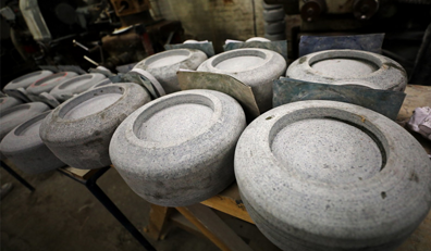 La production d’une pierre de curling demande une vingtaine de processus, incluant la taille de la pierre brute au meulage, en passant par le collage, le polissage à la main.