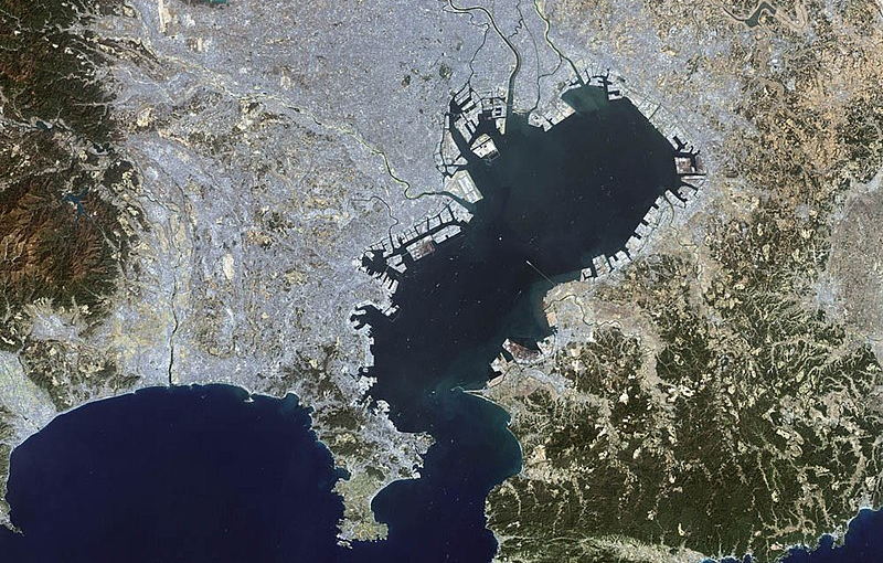 La Baie de Tokyo (photo aérienne) est une anse de 1300 km2 autour de laquelle se concentrent les villes de Tokyo, Yokohama et Kawasaki et Chiba.
